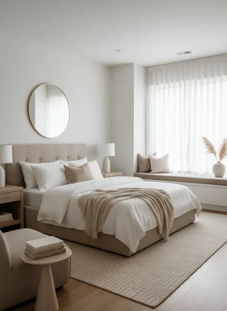 The bed serves as the visual and functional anchor of any bedroom. To achieve a cozy minimalist aesthetic, focus on layering soft, neutral bedding. Start with crisp, warm white sheets and add depth with a plush cream duvet and light beige throw blankets. Incorporating textured accent pillows can keep the minimalist design from feeling flat or one-dimensional. This layered approach adds an irresistible sense of comfort and inviting warmth without introducing visual clutter.
