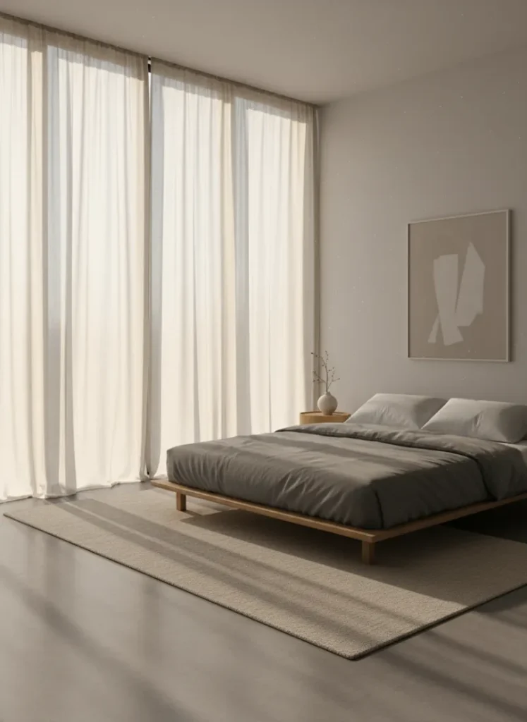 Window treatments offer an excellent opportunity to soften the hard edges of a minimalist room. Installing floor-to-ceiling curtains instantly adds a sense of height, elegance, and graceful movement to the bedroom. Choose lightweight, natural fabrics like sheer linen or soft cotton to allow diffused natural light to filter through during the day. This simple addition brings a romantic, cozy element to the space without overwhelming the minimalist aesthetic.