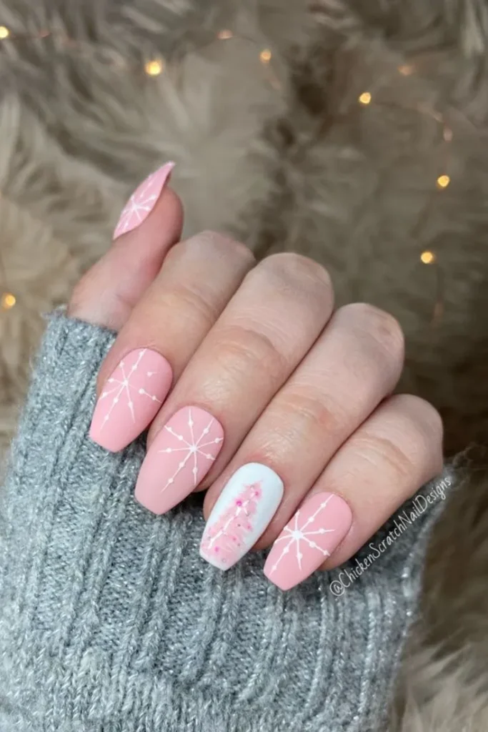 Snowflakes make winter nails extra special. I love Light Pink Winter Nail Designs with tiny white snowflakes because they feel playful and seasonal. The pink base keeps the look soft and feminine.