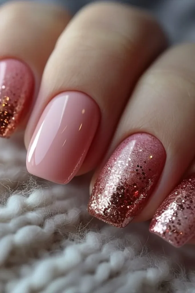 You must try this idea if you love subtle shine. It is perfect for winter parties, dinners, and celebrations. The sparkle makes pink nails feel extra special.