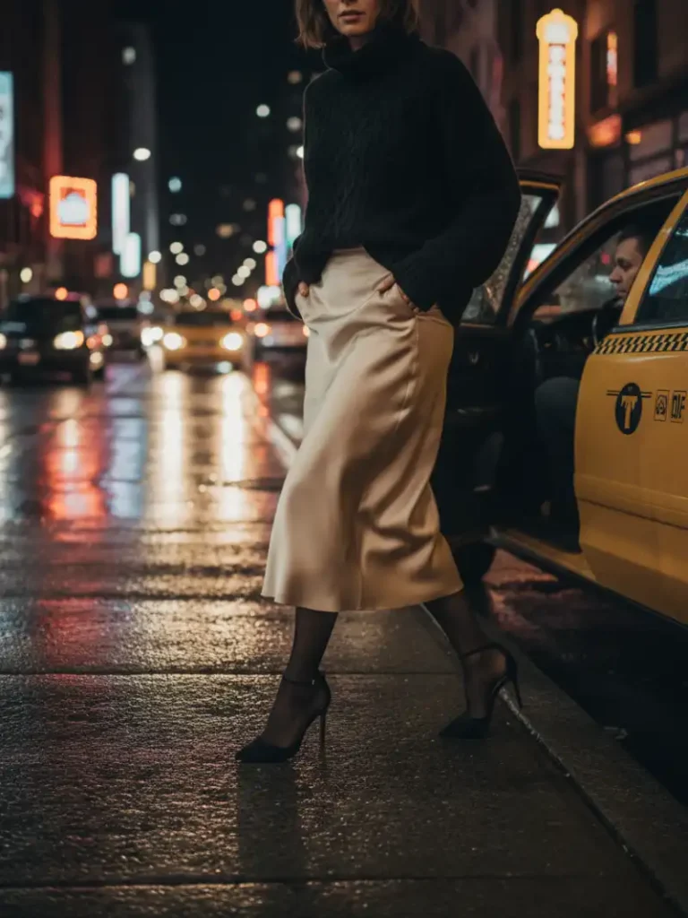 One of the most sophisticated ways to execute a top 10 dinner outfit night classy winter casual look is by playing with the unexpected combination of a silk slip skirt and a heavy, chunky sweater. This pairing is a favorite among style icons because it balances the delicate, feminine nature of silk with the rugged warmth of winter knits. During the colder months, the subtle sheen of a satin or silk midi skirt adds a touch of evening glamour that can sometimes be lost when we are heavily bundled up, making it a perfect choice for a seamless transition from a chilly afternoon to a stylish dinner.