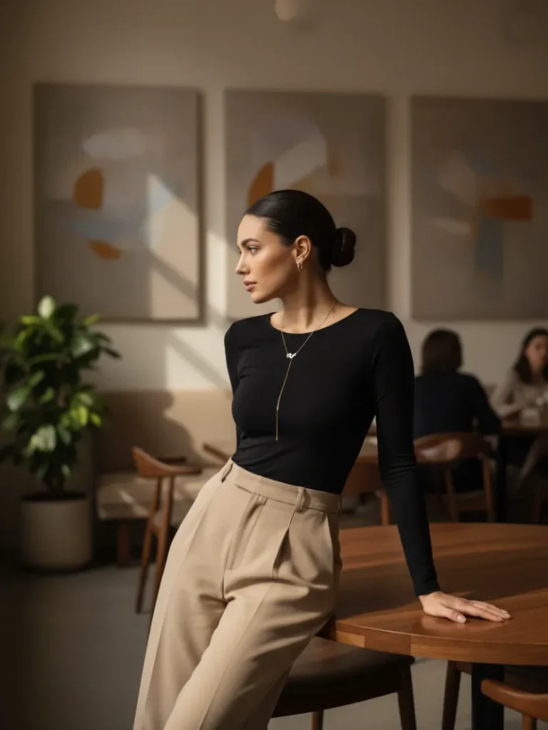 To ensure this look fits the classy winter casual theme, focus on the weight and texture of your trousers. Opting for a wool-blend or a heavy crepe fabric provides the necessary warmth for a cold night while allowing the pants to drape beautifully as you walk. Deep, rich tones like navy, espresso, or charcoal add a seasonal depth that feels sophisticated under the evening lights. The bodysuit should ideally be a long-sleeved version in a high-quality ribbed knit or a sleek jersey fabric. This provides a clean, seamless tuck that stays perfectly in place all night long, eliminating the bulk and constant adjusting that can sometimes come with traditional tucked-in shirts and blouses.