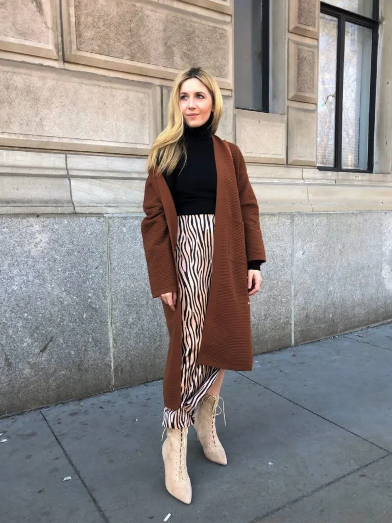 This outfit feels soft and feminine. I like how a cozy cardigan looks with a midi skirt in winter. The boots keep the outfit warm and stylish.