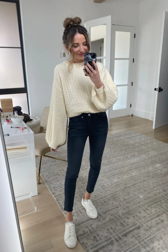 This outfit is relaxed and very trendy. I like how an oversized sweater feels cozy and stylish at the same time. When paired with straight jeans, the look feels balanced and modern. Winter sneakers make it perfect for daily wear.
