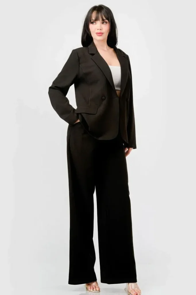 This outfit feels smart and powerful. I really like tailored blazers in winter because they add structure. A soft turtleneck keeps the look warm, while wide-leg pants add style.